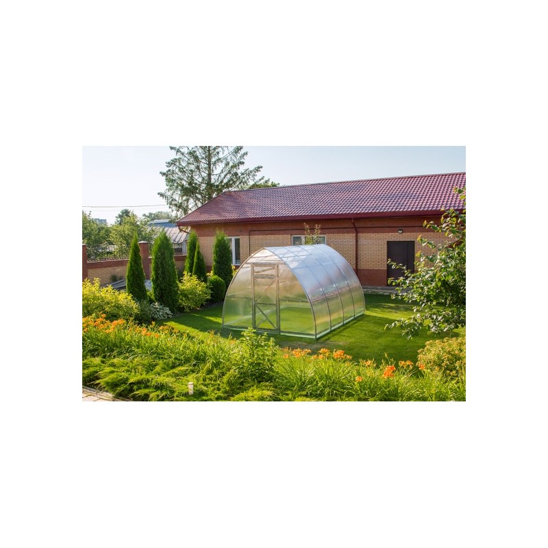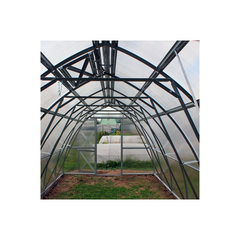 Каркас для теплицы изготовлен из прочного оцинкованного профиля 60х20 мм. Его высота прекрасно подходит для выращивания высокорослых культур, а ширина оптимальна для двух грядок.