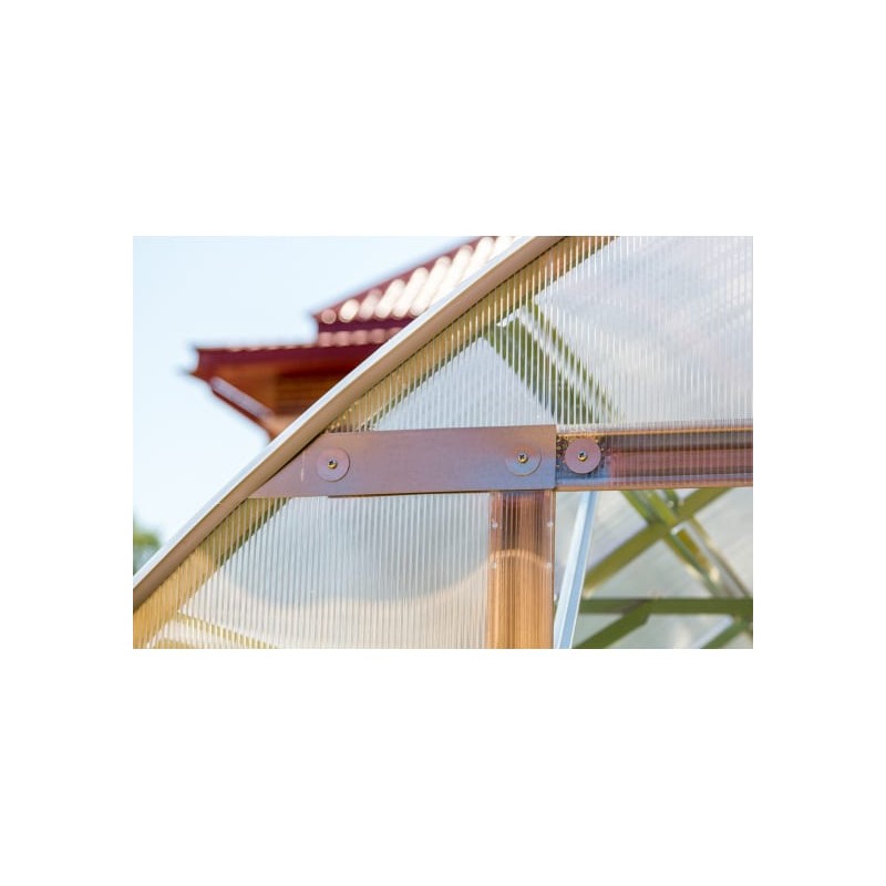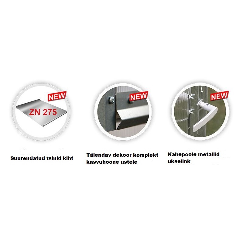 В этой новой теплице усилены двери и форточки и введён в комплектацию стальной декор, который добавляет жёсткость конструкции дверей и форточек, придаёт конструкции больше эстетики и надёжности. Двери и форточки снабжены новой запорной системой. Новые надёжные петли позволяют открытие на 180ºи крепления поликарбоната к конструкции стали ещё надежнее и проще в исполнении.