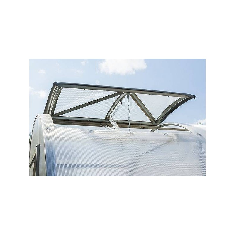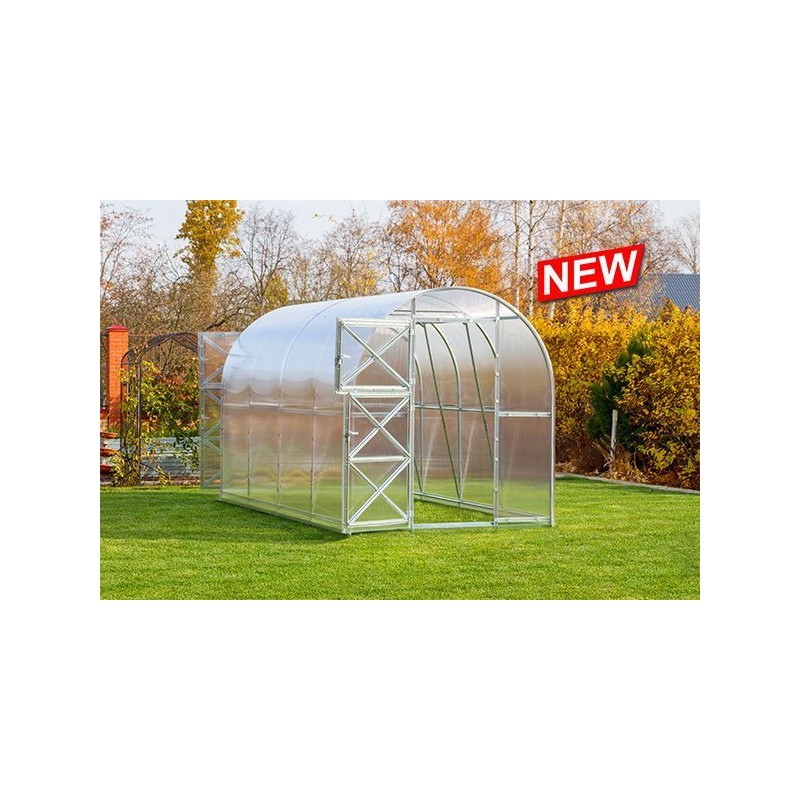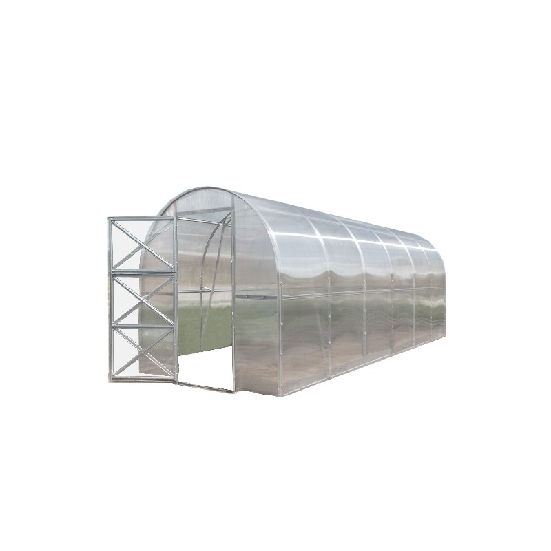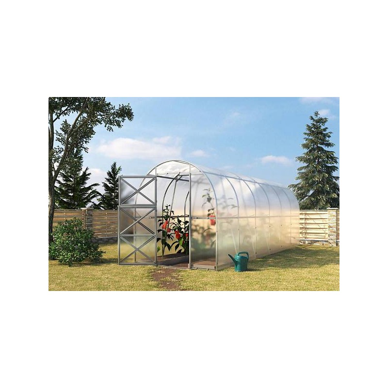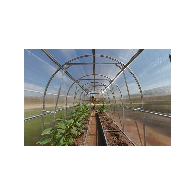 Площадь укрываемого грунта зависит от длины. Высота установленного каркаса теплицы - 2,2м. Каркас теплицы изготовлен из оцинкованного железа и собирается с помощью винтов и гаек. Фундамент для теплицы не требуется, но установка на фундамент допускается. Теплица крепится на грунте закапыванием специальных окончаний каркаса. В комплект входит покрытие для теплицы (2 слойный сотовый поликарбонат 4мм) и все необходимое для крепления покрытия. Теплица имеет два дверных проёма в противоположных торцах и в каждом дверном проеме имеет дверь и форточку.